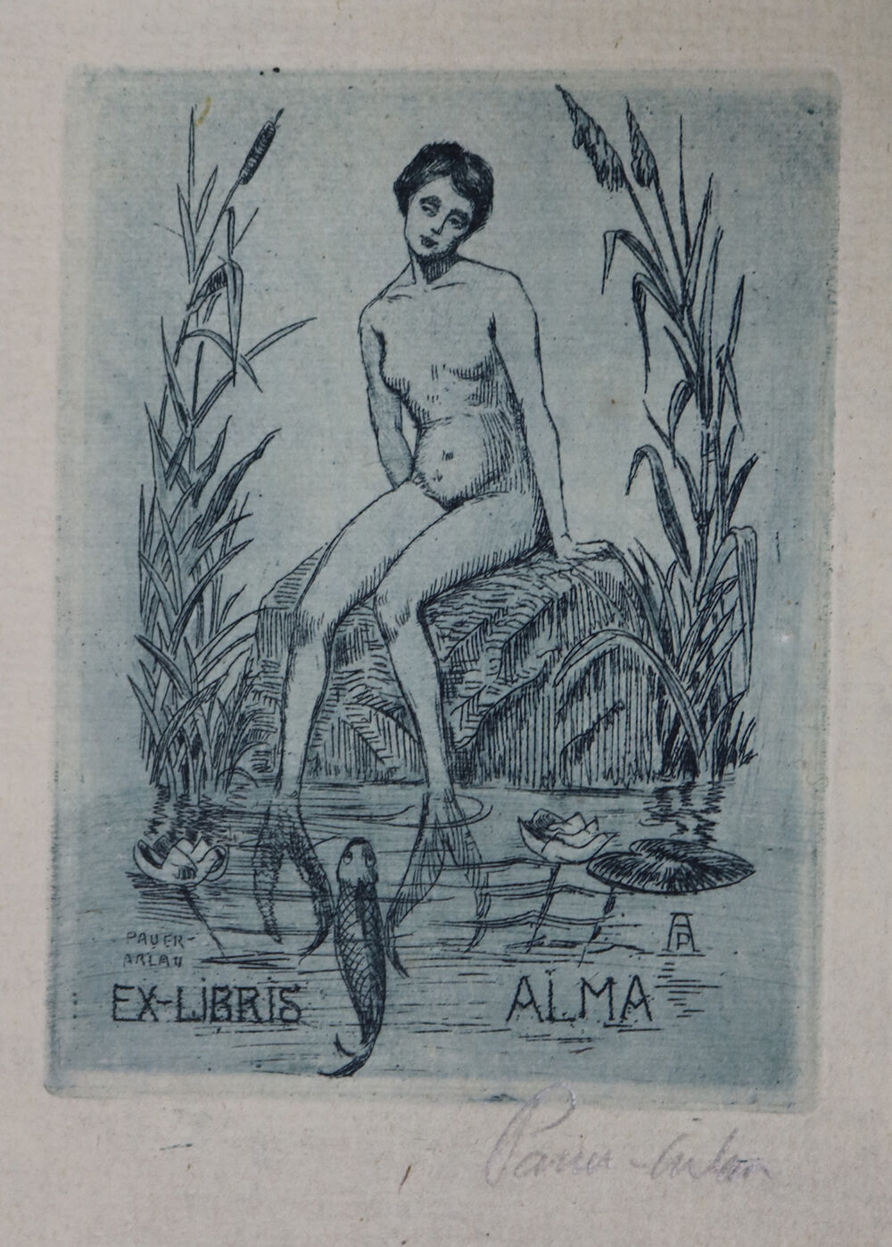 Die Jüdin Alma Rosenthal, geborene Mohr, gab bei Carl Pauer-Arlan aus Mährisch-Weißenkirchen ein Exlibris in Auftrag. Er versah es mit dem Motiv einer Jungfrau, deren Füße als Fischschwänze in einen Teich hängen. So unbeschwert das Leben von Alma begonnen haben mag – auch sie wurde während des Nationalsozialismus nach Theresienstadt deportiert und dort ermordet.