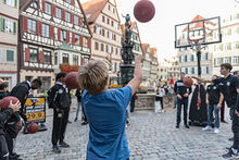 Beim Körbe werfen auf dem Marktplatz sammelten die Spieler mit Oberbürgermeister Boris Palmer Spenden für ein nachhaltiges, lokales Projekt. Jeder Treffer, der vom Rathausbalkon in dem mobilen Basketballkorb landete, bedeutete eine Spende für die Studierendeninitiative „nez- Nachhaltige Entwicklung – gemeinsam für die Zukunft“. „nez“ bietet Bildungs- und Informationsangebote im Bereich der nachhaltigen Entwicklung in Form von Vorträgen, Projekttagen und Workshops an. Insgesamt wurden 2.500 Euro Spendengelder, gesponsort von den Stadtwerken Tübingen und iPoint-systems GmbH, gesammelt.