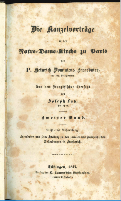 Erster Band mit Kanzelvorträgen, die in der Notre-Dame-Kirche zu Paris gehalten und 1846 in Tübingen als Übersetzung erschienen. Bild: Stadtmuseum TübingenInschriften von zwei Vikaren. Bild: Stadtmuseum TübingenTitelblatt des zweiten Bands. Bild: Stadtmuseum Tübingen