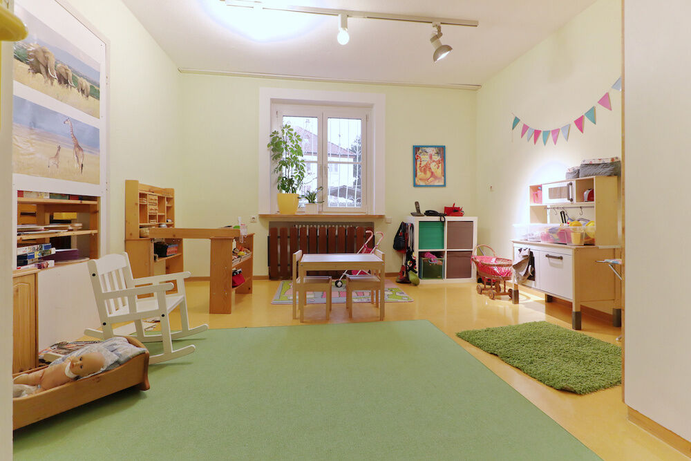 Eingangsbereich mit Schwarzem Brett und Garderobe Sofa und im Hintergrund Weltkarte Arbeitstisch mit Malutensilien Großer offener Raum mit Tischen und Regal Kaufladen und kleine Tische für Rollenspiele Arbeitstisch mit Webrahmen Großes Sofa und Sitzkissen Tische und Regale mit Spielen Großer Raum mit Kletterelementen Turnhalle mit Kletterwand, Bänken und Bällen