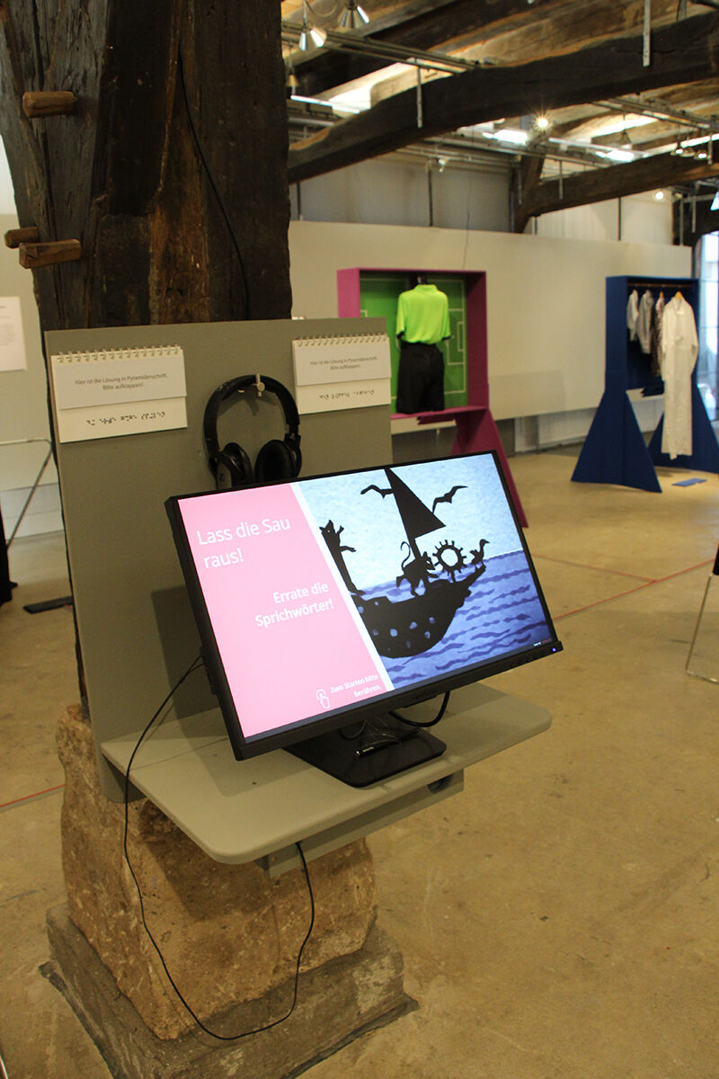 Sprichwörter und Redewendungen mit allen Sinnen erraten: Das können Besucherinnen und Besucher der Familienausstellung „Lass die Sau raus!“. Wie das geht? An sogenannten „Hands-on-Stationen“ können sie Gegenstände ertasten und so das passende Sprichwort erraten. Das macht die Redewendungen und Sprichwörter sinnlich erfahrbar. An anderen Stationen kann man etwas suchen, die eigene Geschicklichkeit testen oder versuchen, in einem dunklen Raum die Orientierung zu behalten – immer auf der Suche nach dem passenden Sprichwort. An Medienstationen sind Trickfilme und Pantomime-Filme zu sehen, mit deren Hilfe man Redewendungen erraten kann.