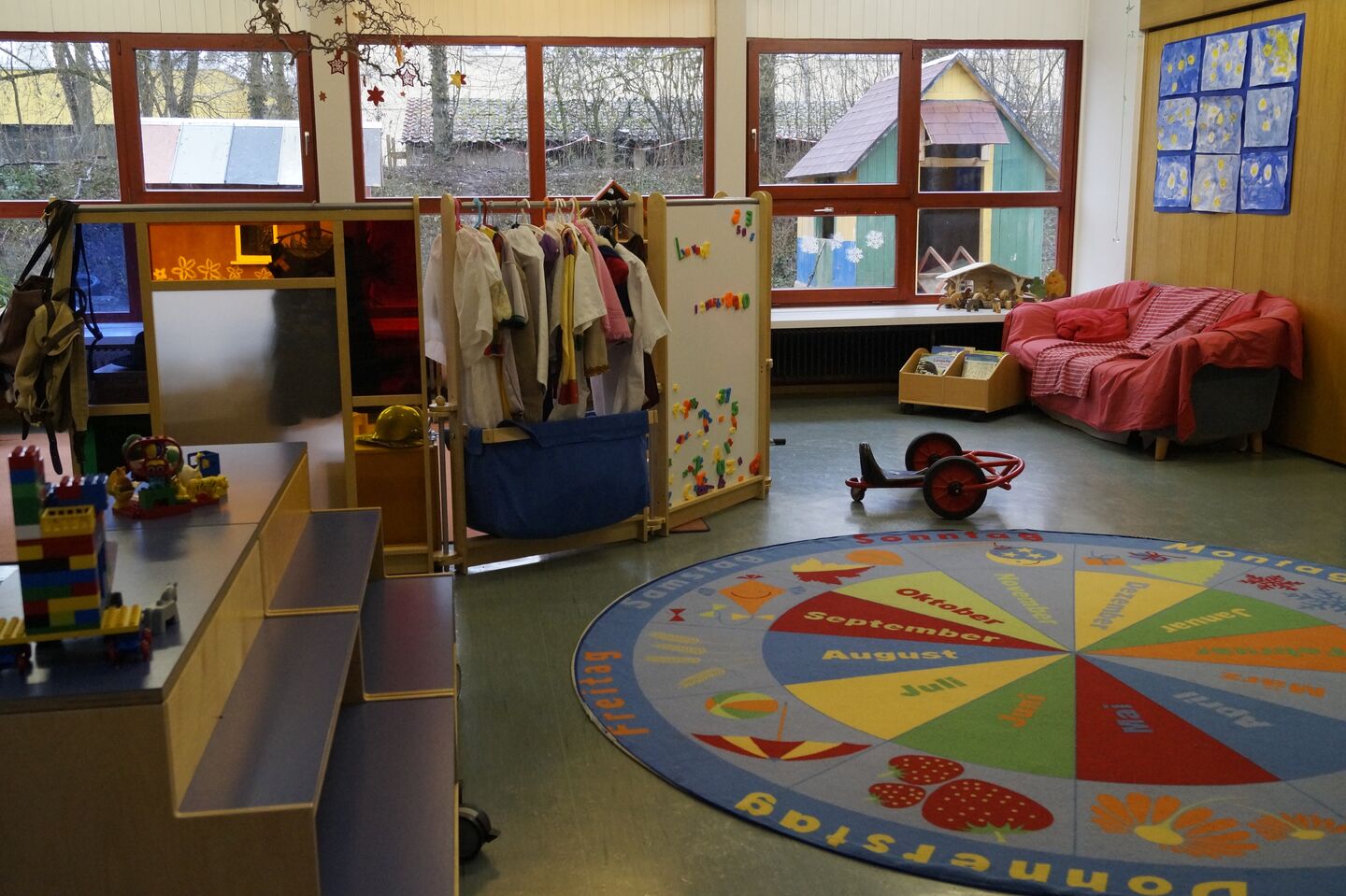 Runder Teppich und im Hintergrund Regale und große Fensterfront Kleine Matte für Bewegungsspiele Holzeisenbahn auf dem Fußboden Gedeckte Tische für Kinder Blick aus Gruppenraum in den Garten Jahresuhr und Instrumente Tisch mit Malutensilien, darüber an Leine aufgehängte Bilder Großes Sofa und davor Bücherkiste Spieltisch und im Hintergrund Kaufladen Puppenszene St. Martin mit Pferd