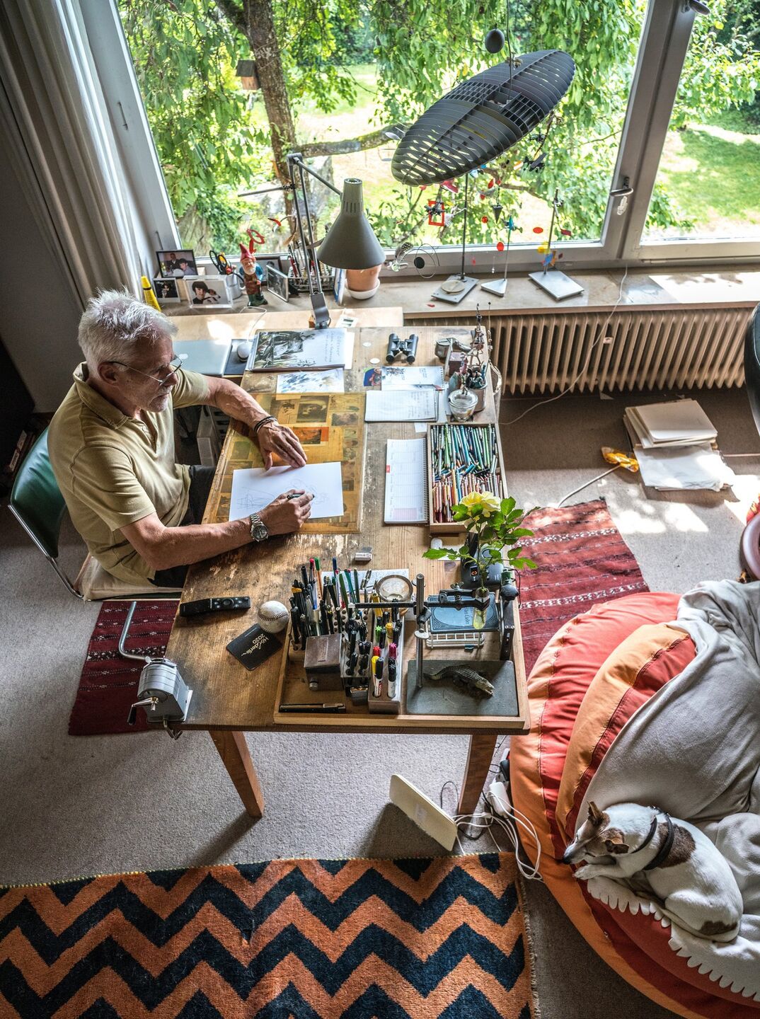 Der originale Arbeitstisch des Künstlers wird in der Ausstellung zur Mitmachstation: Hier können die Besucher_innen der Ausstellung sich selbst kreativ-komisch ausprobieren und zum Stift greifen.