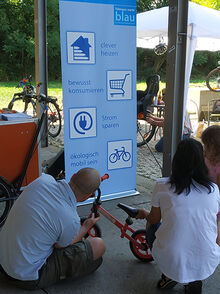 Am 16. Juli 2022 informierten die Mitarbeiter_innen der Stabstelle Umwelt- und Klimaschutz beim KIT Radaktionstag in der Panzerhalle über umweltfreundliche Mobilitätsangebote und Fördermittel der Universitätsstadt Tübingen. Es wurden diverse Fahrräder mit „Tübingen macht blau“ Klingeln nachgerüstet.