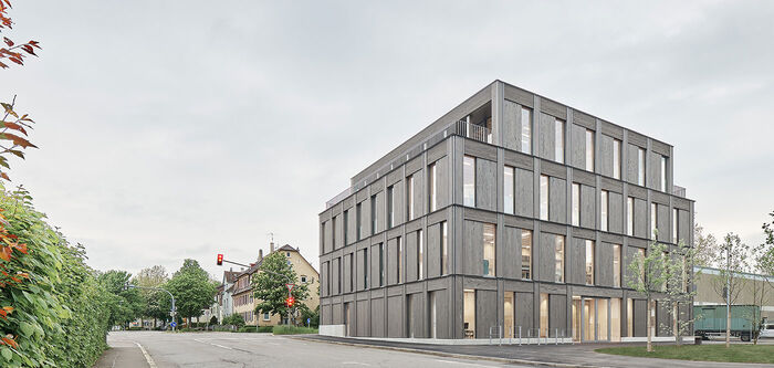 Mit einer schlichten, geometrischen Ordnung präsentiert sich seit 2023 die Geschäftsstelle der GWG in einer Holz-Beton-Hybrid-Bauweise. Dabei ist das Holz an vielen Ecken zu sehen: