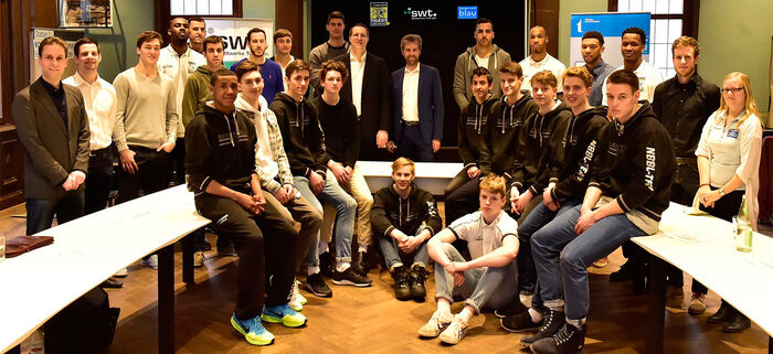 Energiespartraining als besondere Übungseinheit: Im Februar waren die Profi- und Nachwuchsbasketballspieler der WALTER Tigers im Tübinger Rathaus zu Gast. Beim Aktionstag mit den Stadtwerken Tübingen und der Universitätsstadt Tübingen ging es nicht darum, besonders viele Körbe zu werfen. Im Mittelpunkt stand das Thema, wie im Alltag ganz einfach Energie gespart werden kann.
