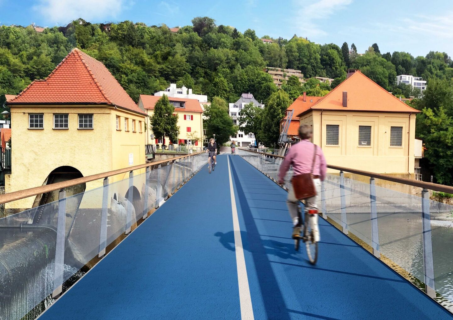 Im Juli 2023 wurde die Radbrücke Ost auf der Höhe des Neckar-Stauwehrs eröffnet. Die Radbrücke Ost mündet nördlich in die Brückenstraße, die zu einer Fahrradstraße umgebaut wurde. Südlich des Neckars führt die Verbindung auf das Blaue Band in der Schaffhausenstraße zu und schließt damit die Lücke im Radverkehr zwischen Gartenstraße und Schaffhausenstraße. Zusammen mit der zukünftigen Rad- und Fußgängerunterführung am Güterbahnhof, die Ende 2025 fertiggestellt werden soll, bildet die Radbrücke Ost eine durchgängige Nord-Südachse, die die Südstadt und das Französische Viertel schneller und direkter an die Innenstadt anbindet. Die Brückenstraße zwischen der Radbrücke und der neuen Unterführung wird ebenfalls fahrrad- und fußfreundlicher umgestaltet. Hieran wird aktuell geplant.