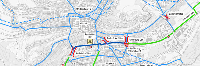Übersicht des Radwegenetzes mit dem blauen Band (dunkelblau). Bild: Universitätsstadt Tübingen