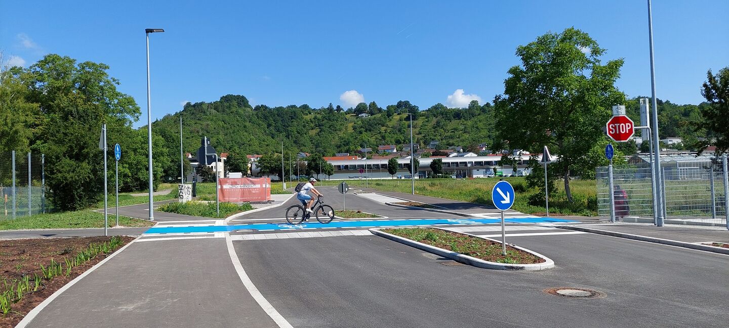Am Freitag, 6. Juni 2025, wurde das neue Gewerbegebiet Aischbach II in Tübingen offiziell eröffnet. Oberbürgermeister Boris Palmer gab den Startschuss für das neue Areal, das künftig zahlreichen Unternehmen Raum bietet. Für die Erschließung der neuen Betriebe wurde eine neue Straße durch das Gebiet verlegt. Diese quert den Rad- und Fußweg zwischen Tübingen und Unterjesingen/Ammerbuch – eine der am stärksten befahrenen Radverbindungen im Umland. Damit Radfahrende hier weiterhin sicher und zügig unterwegs sein können, wurde die Querung mit mehreren Maßnahmen ausgestattet: