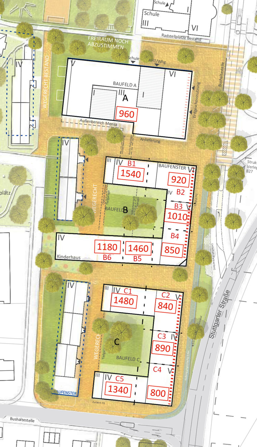 Bei der Preisermittlung ist zu beachten, dass die angegebenen Parzellen nur ein Vorschlag sind. Die endgültigen Grundstückszuschnitte hängen davon ab, wie groß die eingereichten Projekte sind. Zum jeweiligen Baufenster kommt noch ein Anteil an privatem und gemeinschaftlichem Garten innerhalb des Hofs dazu. Die angegebenen Werte sind daher als Orientierungswerte zu verstehen und treffen keine Aussage über den exakten endgültigen Kaufpreis.