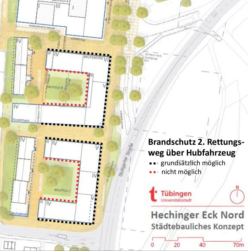 Aufstellflächen für Hubrettungsfahrzeuge sind um die Höfe in Nord-, Ost- und Südrichtung geplant (siehe Bild). Da die Innenhöfe der geplanten Höfe nicht direkt von Rettungsfahrzeugen angefahren werden können, gelten hier besondere Regelungen: Aufenthaltsräume mit einer Brüstungshöhe von bis zu acht Metern beziehungsweise einer Fußbodenhöhe von bis zu sieben Metern (in der Regel das zweite Obergeschoss; Gebäudeklassen eins bis drei) können mit tragbaren Leitern der Feuerwehr erreicht werden. Für höherliegende Wohnungen, die lediglich zum Innenhof ausgerichtet sind, muss der zweite Rettungsweg anderweitig gesichert werden, etwa durch eine Verbindung innerhalb der Wohnung zur gegenüberliegenden, anleiterbaren Seite oder einen zweiten baulichen Rettungsweg.