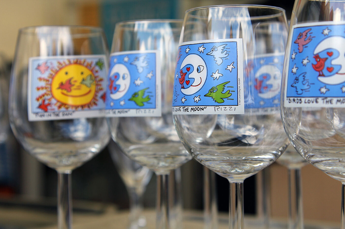 „A votre santé, salute, Prost“ – ein Glas Rosé aus Aix-en-Provence oder Chardonnay-Sekt aus Perugia rundet den Genuss ab. Der Erlös aus dem Verkauf der exklusiv gestalteten Gläser des Pop-Art-Künstlers James Rizzi kommt der Rheuma-Ambulanz der Tübinger Klinik für Kinder- und Jugendmedizin zugute.