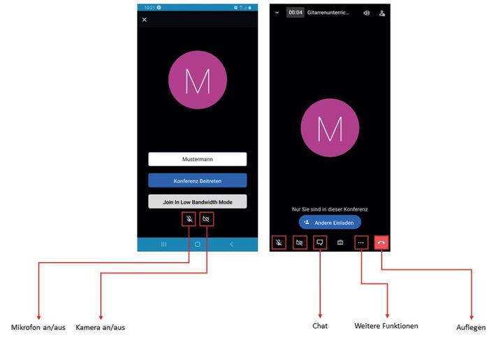 - Wenn Sie auf den blauen Button „Erstellen/Beitreten“ geklickt haben, dann müssen Sie im Anschluss Ihren Namen eingeben. Er wird allen Teilnehmer_innen des Meetings angezeigt. Klicken Sie im Anschluss auf „Konferenz Beitreten“. So sehen die Benutzeroberflächen aus: