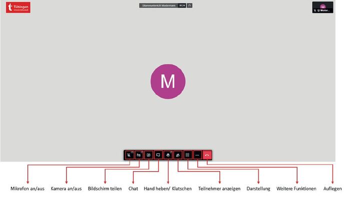 - Über diese Symbole steuern Sie das Meeting. Zum Verlassen klicken Sie auf den roten Hörer.
