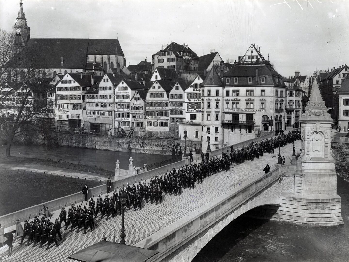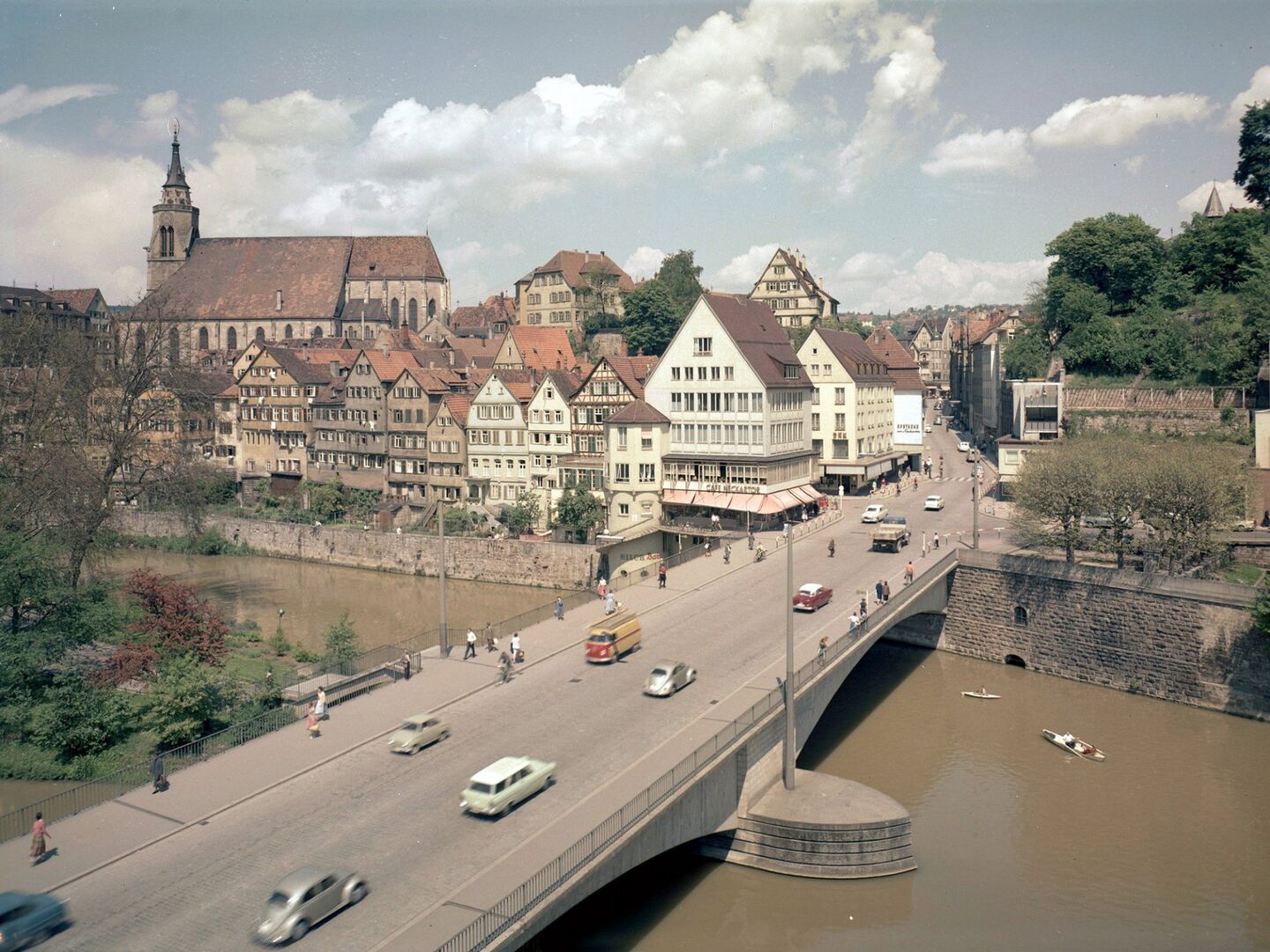 Die neue Neckarbrücke wurde bis 1901 nach den Plänen von Karl Leibbrand und Heinrich Halmhuber ausgeführt. Sie hatte zwei elegant geschwungene Bögen und war im Kern aus modernem Stampfbeton. Ihre Breite (13,70 Meter) und Tragkraft waren so berechnet, dass darauf auch eine Straßenbahn verkehren konnte – ein futuristischer Plan, der bis heute auf seine Verwirklichung wartet.