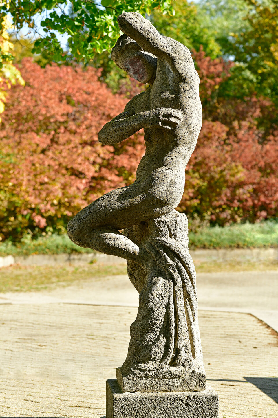 Das Abbild eines badenden jungen Mannes trägt deutlich Elemente des Jugendstils. Ursprünglich schuf Richard Knecht die Skulptur für das 1914 eröffnete Uhlandbad. Dort thronte sie zentral auf einem Sockel am Kopfende des Beckens und prägte so den gesamten Raumeindruck der Badeanstalt. Ein Abguss von ihr steht heute in München.