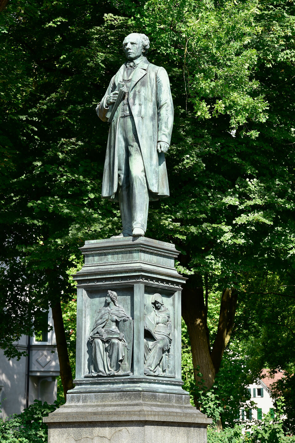 Es ist das Nationaldenkmal der Deutschen für Ludwig Uhland (1787–1862). Allegorische Frauengestalten am Sockel weisen auf Uhlands Wirken in der Dichtung, der Politik und der Wissenschaft hin. In allen drei Disziplinen hat Uhland Großes geleistet: Er ist der zentrale Vertreter der Schwäbischen Romantik, setzte sich als Abgeordneter des württembergischen Landtags und der Paulskirchenversammlung für die Demokratie ein und erforschte als Germanist altdeutsche Dichtungen und Sagen.