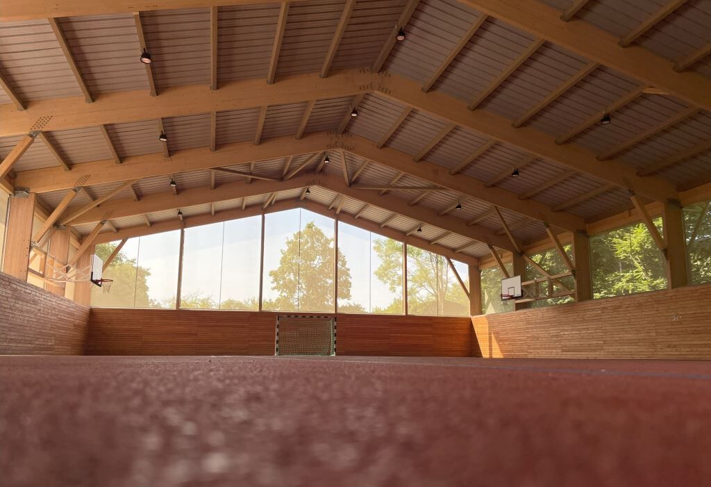Halle, Nebengebäude und die umlaufende Prallwand sind in Holz konstruiert, lediglich die Fundamente und Bodenplatte sind massiv aus Stahlbeton. Auf dem Trapezblechdach findet eine große PV-Anlage mit 237 KWp Platz. Die Flächen zwischen Prallwand und Dach sind mit einer mikroperforierten Membran geschlossen, die luftdurchlässig ist, aber weitgehend Regen, Schnee und Laub abhält.