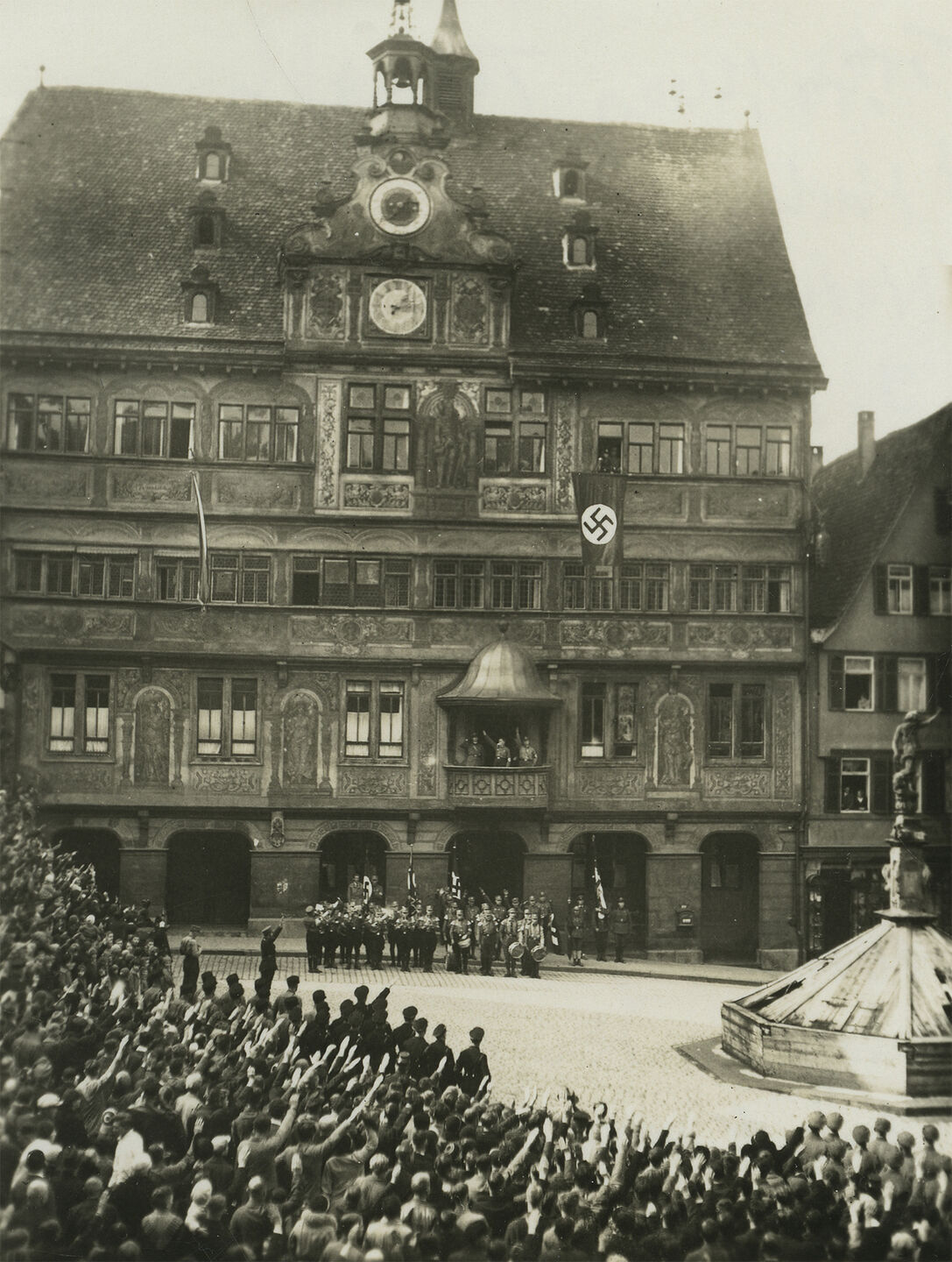Am 6. März 1933 gewannen die Nationalsozialisten die Reichstagswahlen. Drei Tage später hissten NSDAP-Funktionäre am Tübinger Rathaus die Hakenkreuzfahne. Mit der „Gleichschaltung“, die dem Ermächtigungsgesetz folgte, sicherten sich die Nationalsozialisten die Macht in Staatsorganen, Verbänden und Vereinen. Foto: Stadtarchiv Tübingen/Hugo Kocher