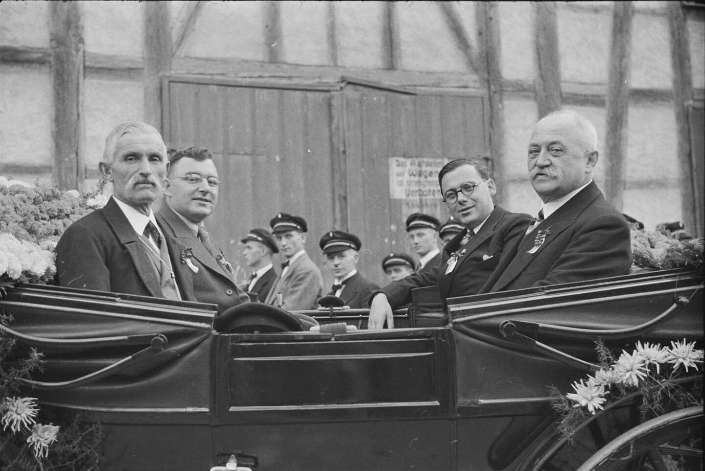 Die Aufnahme von 1935 zeigt Adolf Scheef (rechts). Er war von 1927 bis 1939 Oberbürgermeister. Sein Nachfolger bis 1945 war Ernst Weinmann (zweiter von links). Er wurde in Jugoslawien als Kriegsverbrecher zum Tode verurteilt und 1947 hingerichtet. Foto: Stadtarchiv Tübingen/Walter Kleinfeldt