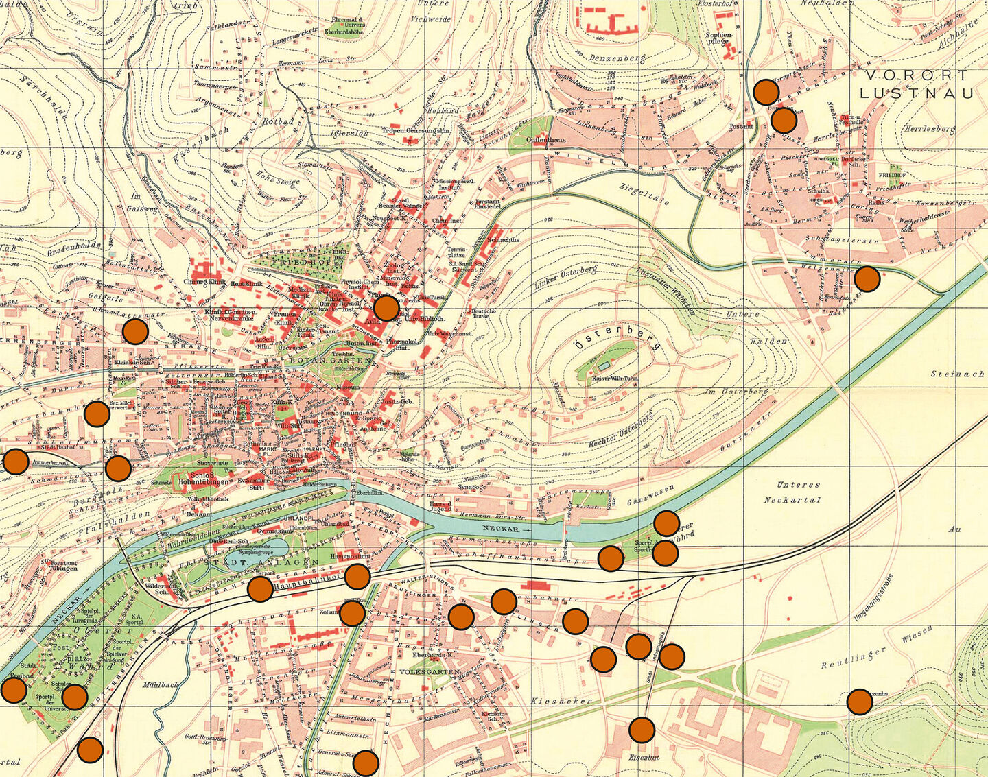 Karte der Standorte von Zwangsarbeiter- und Kriegsgefangenenlagern im Tübinger Stadtgebiet zwischen 1939 und 1945. Karte: Universitätsstadt Tübingen, Kartengrundlage: Amtlicher Stadtplan