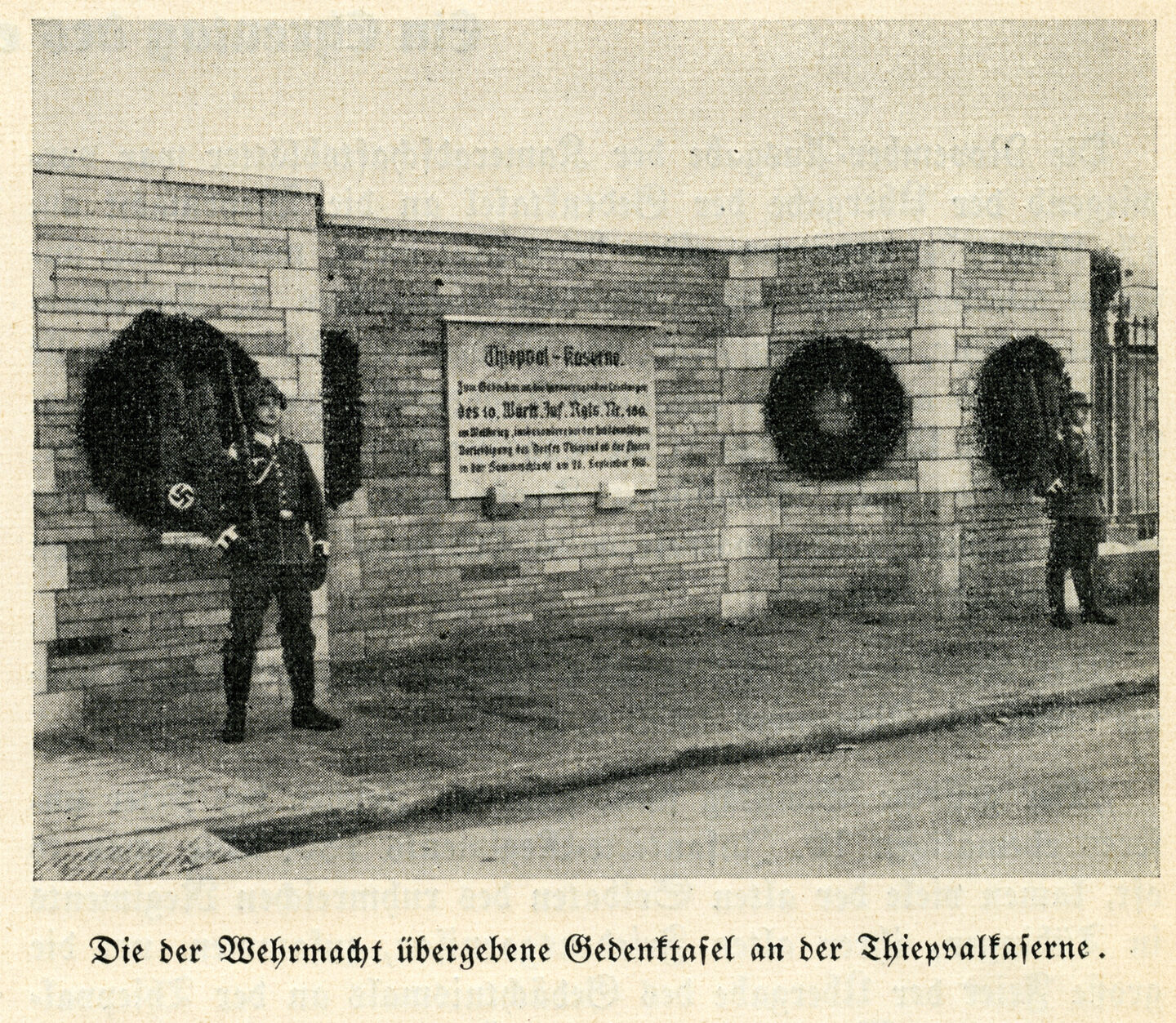 1938 wurde die Gedenktafel in der Thiepvalstraße (heute Hegelstraße) eingeweiht und die Kaserne nach dem französischen Dorf Thiepval benannt. Dort hatten 1916 württembergische Soldaten in einer verlustreichen und verlorenen Schlacht gekämpft, weshalb später „Thiepval“ als Sinnbild für „Heldentod“ galt. Abbildung: Stadtarchiv Tübingen