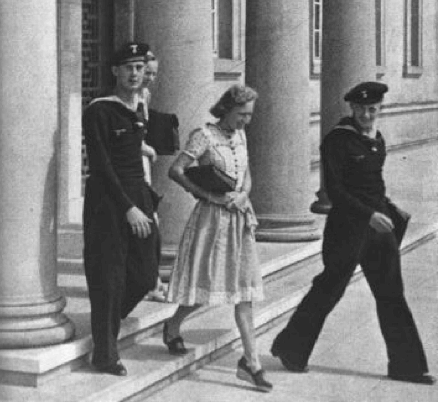Angehörige der Marineärztlichen Akademie und Studentinnen vor der Neuen Aula, 1941/1942. Ab 1941 wurden in Tübingen angehende Marineärzte ausgebildet. Sie waren im Evangelischen Stift, dem Wilhelmsstift und der Thiepval-Kaserne einquartiert und studierten an der Medizinischen Fakultät. Foto: Paul Hommel