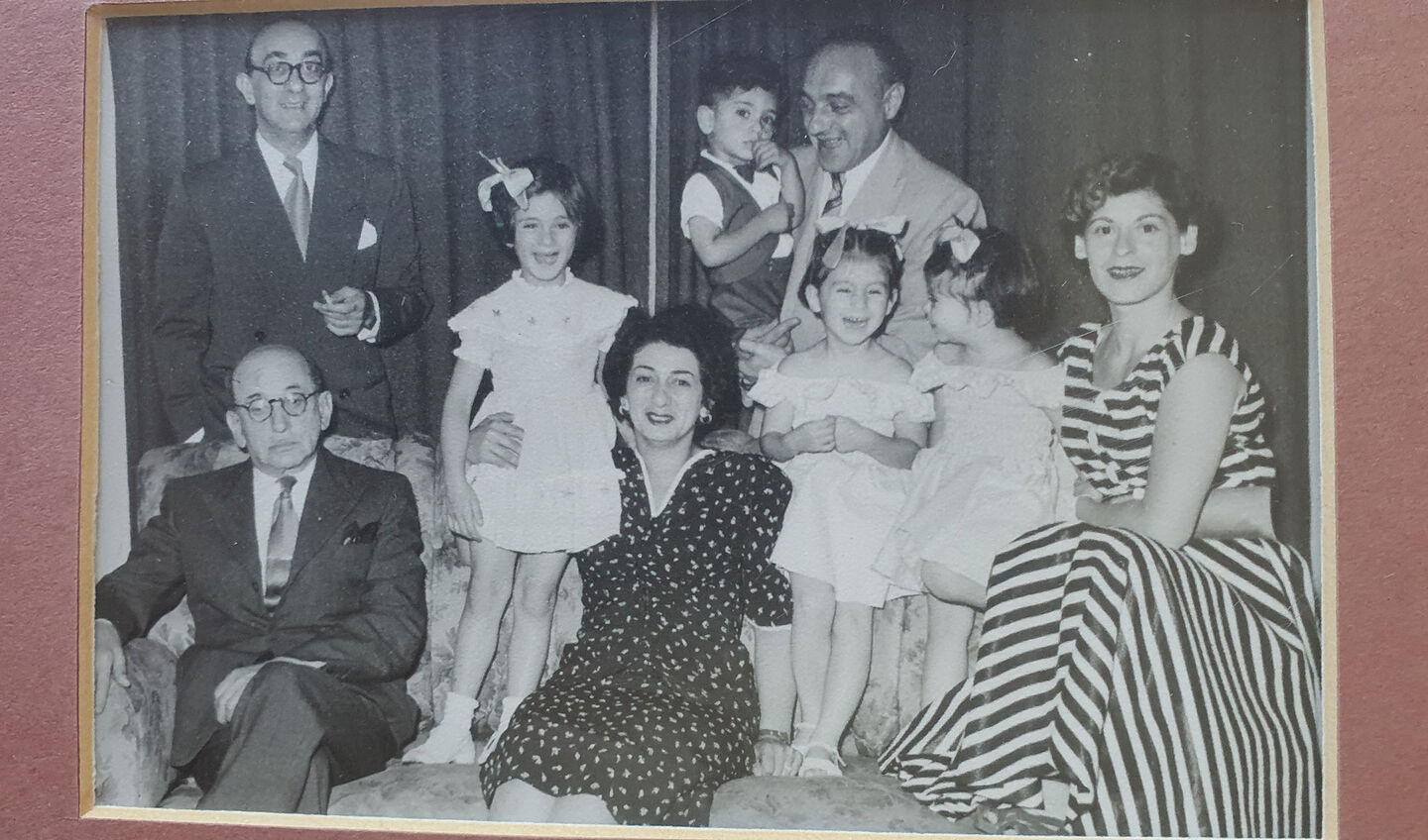 Von links nach rechts vorne: Leopold Hirsch mit seiner Tochter Lore Silbermann und der Schwiegertochter Stephanie Hirsch, geb. Spangenthal und den drei Enkelinnen Janette, Carol und Monica.