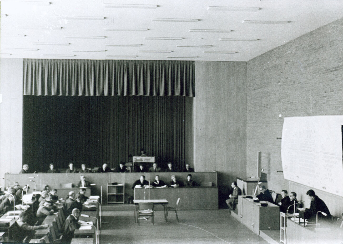 Blick in den Gerichtssaal des Haus Gallus während der Verhandlung des ersten Frankfurter Auschwitz-Prozesses, 1964/65
