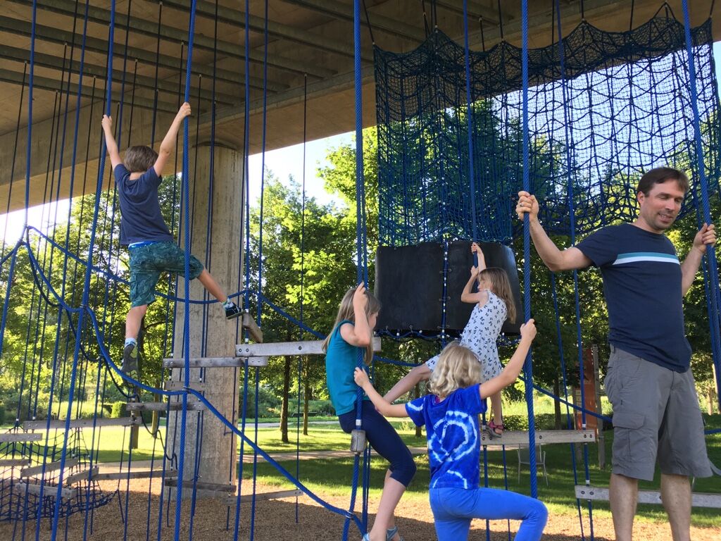 Dort, wo heute das Kleinspielfeld das Ende des Parks im Südwesten bildet, wird im Jahr 2023 die neue Fahrradbrücke West in das „Blaue Band“ übergehen. Dass diese nicht wie ein Fremdkörper wirken muss, sondern durch ihre ganz eigenen Möglichkeiten einer überdachten Spielfläche das Angebot an Sport und Spiel abrunden kann, zeigt die folgende Skizze. Das Spielfeld und weitere Bewegungsmöglichkeiten liegen eingebettet und leicht vertieft zwischen den Rampen der Fahrradbrücke. So entsteht eine Art Tribüne zum Sitzen und Zugucken. Das Spielfeld wird verkleinert und durch Bewegungsangebote wie Trampoline, Schaukeln und Kletternetze ergänzt, die in die Rampe integriert werden. Besonders wichtig war in diesem Bereich die Berücksichtigung der Belange von Mädchen.
