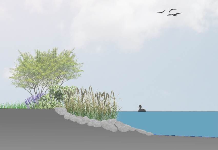 Die Uferbereiche werden angepasst. Sie werden überwiegend naturnah und nicht zugänglich gestaltet. Dazu kommen einige wenige Wasserzugänge. So werden bewusst Bereiche entstehen, an denen man gezielt ans Wasser kann und andere, die einen durch die Art der Bepflanzung komplett davon abhalten.