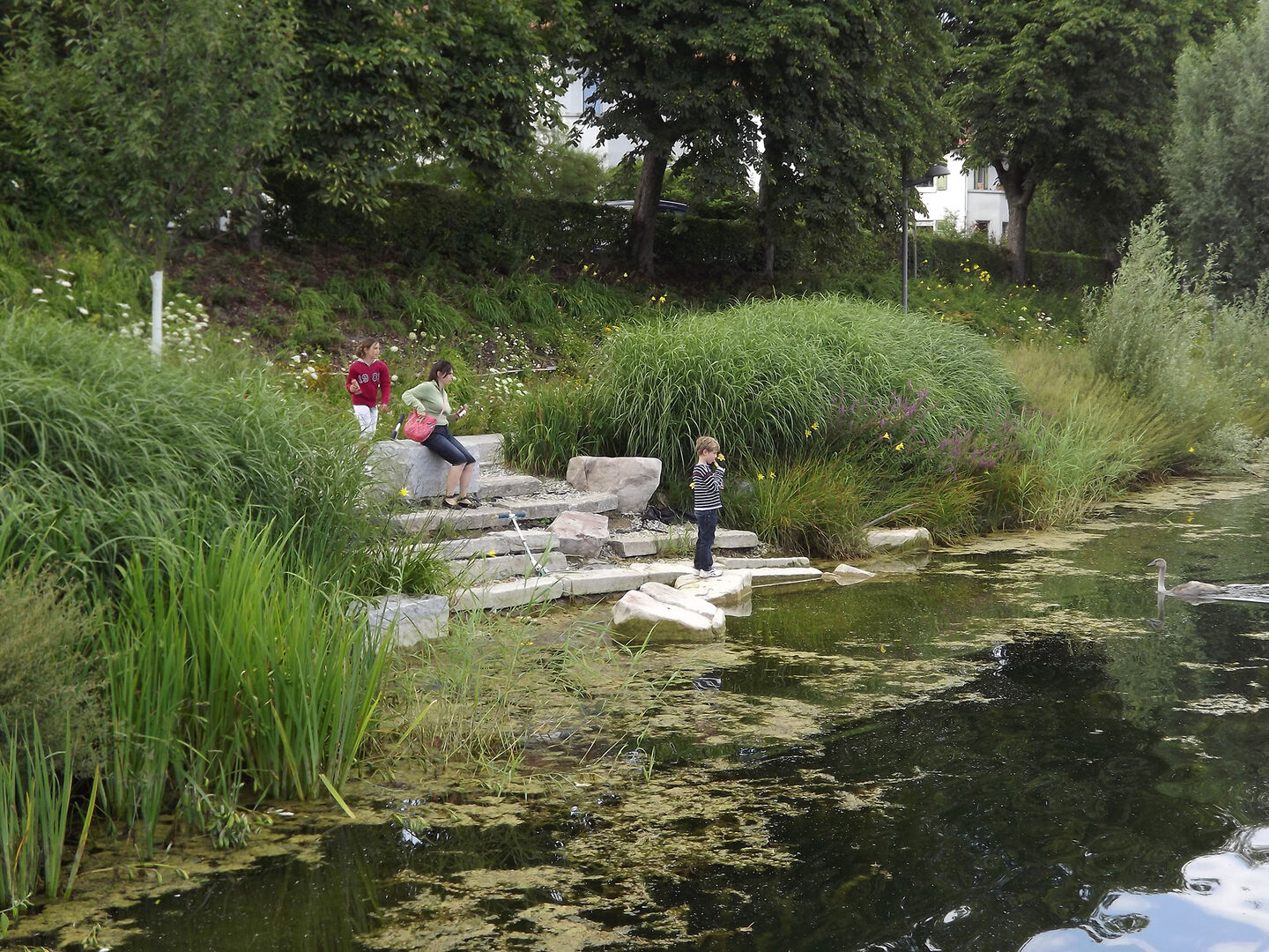 Der See erhält eine Uferbepflanzung mit Schilf und typischen heimischen Pflanzen. Das heute offene und wenig gestaltete Ufer wird gegliedert. Neben den bepflanzten Abschnitten gibt es Bereiche, die für die Menschen zugänglich gestaltet werden. Dabei entsteht ein bewusst inszenierter Wechsel von Bereichen, die durch Elemente wie Steg, Steine oder Stufen den Zugang zum Wasser ermöglichen, und Bereichen mit dichter Bepflanzung, die den Zugang verhindert. Dadurch werden Rückzugsräume für Kleinlebewesen und Vögel geschaffen (siehe hierzu auch die Informationen unter Seeufer).