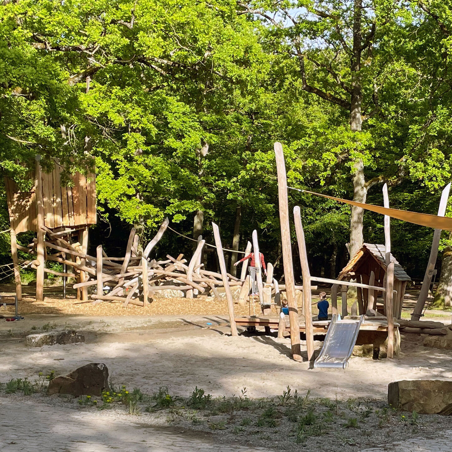 - für unter 6-Jährige: Sandspielbereich mit kleiner Rutsche, Spielhäuschen (barrierefrei), Klettern und Balancieren