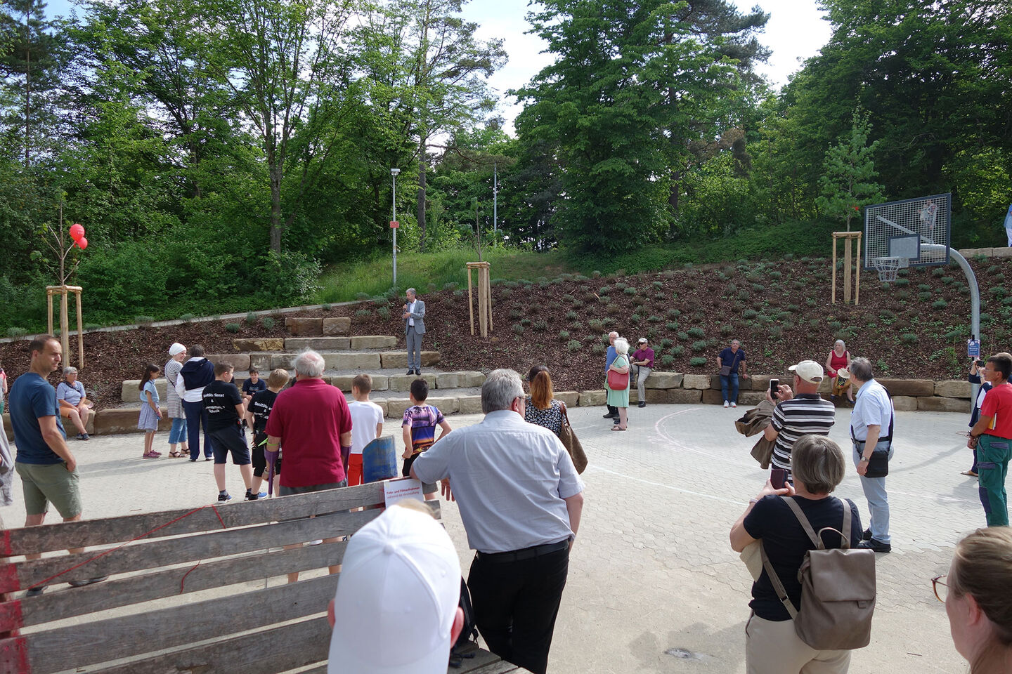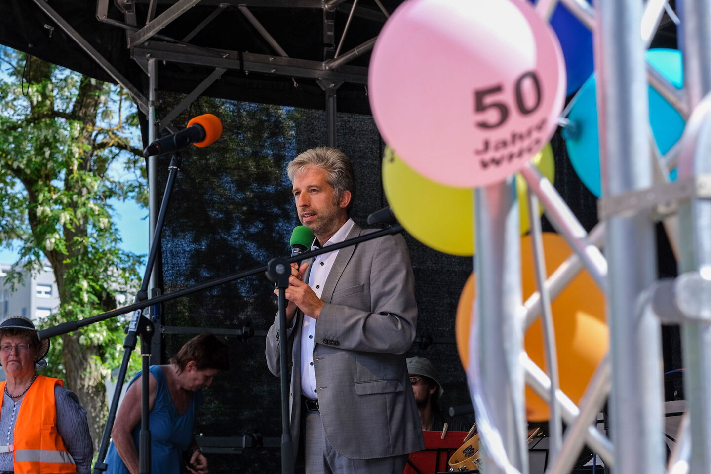 Oberbürgermeister Palmer eröffnete die Feierlichkeiten und lud anschließend zu einer Gesprächsrunde über die Stadtteilentwicklung von Waldhäuser-Ost in das Foyer der Geschwister-Scholl-Schule ein. Mit dabei waren auch Baubürgermeister Cord Soehlke und Sozialbürgermeisterin Dr. Daniela Harsch. Das Jubiläum war ein guter Anlass, um auch über die Zukunft des Stadtteils zu sprechen. Das Fest wurde organisiert von Anne Kreim, Vorsitzende des Stadtteiltreffs WHO, in Kooperation mit dem Team Soziale Stadt. Es wurde von zahlreichen Firmen und der Universitätsstadt Tübingen unterstützt.