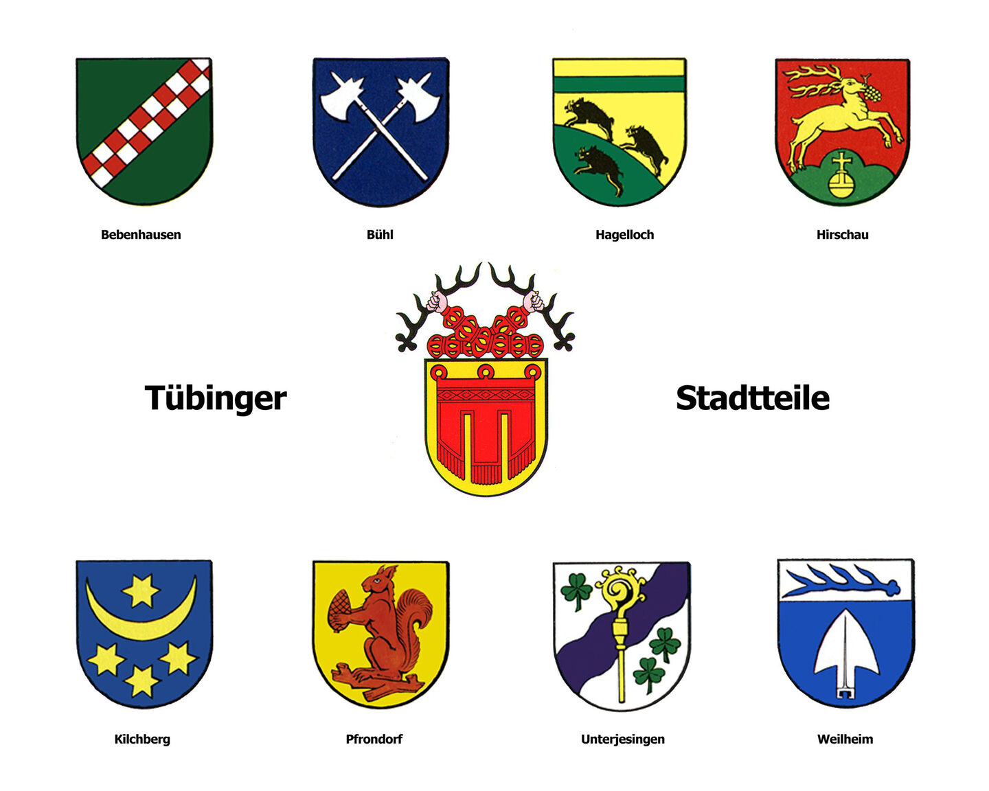 Die Universitätsstadt Tübingen umfasst neben der Kernstadt die folgenden Stadtteile mit Ortschaftsverfassung: Bebenhausen, Bühl, Hagelloch, Hirschau, Kilchberg, Pfrondorf, Unterjesingen und Weilheim. In Lustnau und Derendingen befinden sich Bürgerbüros, die ebenfalls einen umfassenden Bürgerservice bieten.