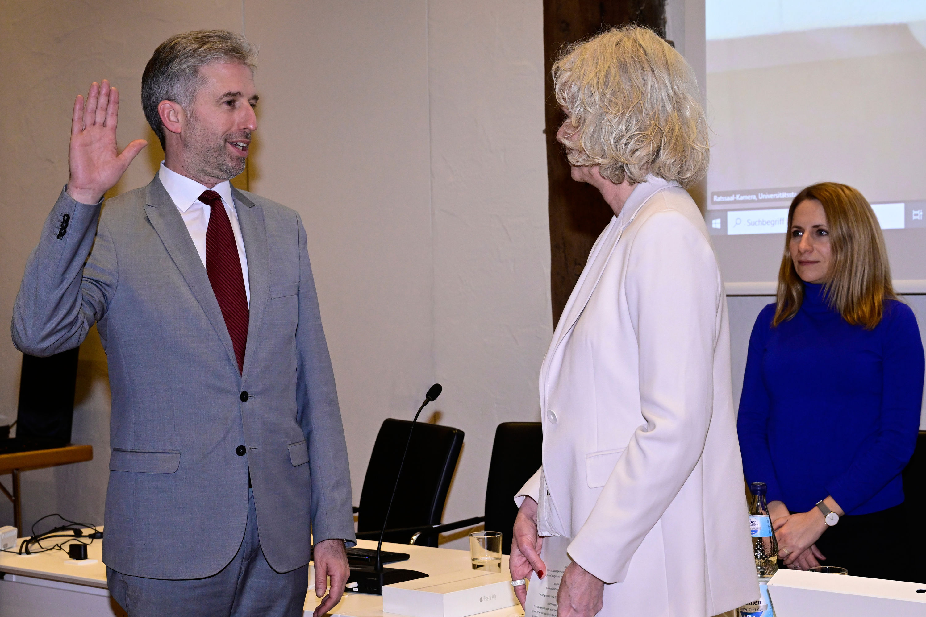 Stadträtin Annette Schmidt nimmt offizielle Verpflichtung von Oberbürgermeister Boris Palmer für seine dritte Amtszeit vor.