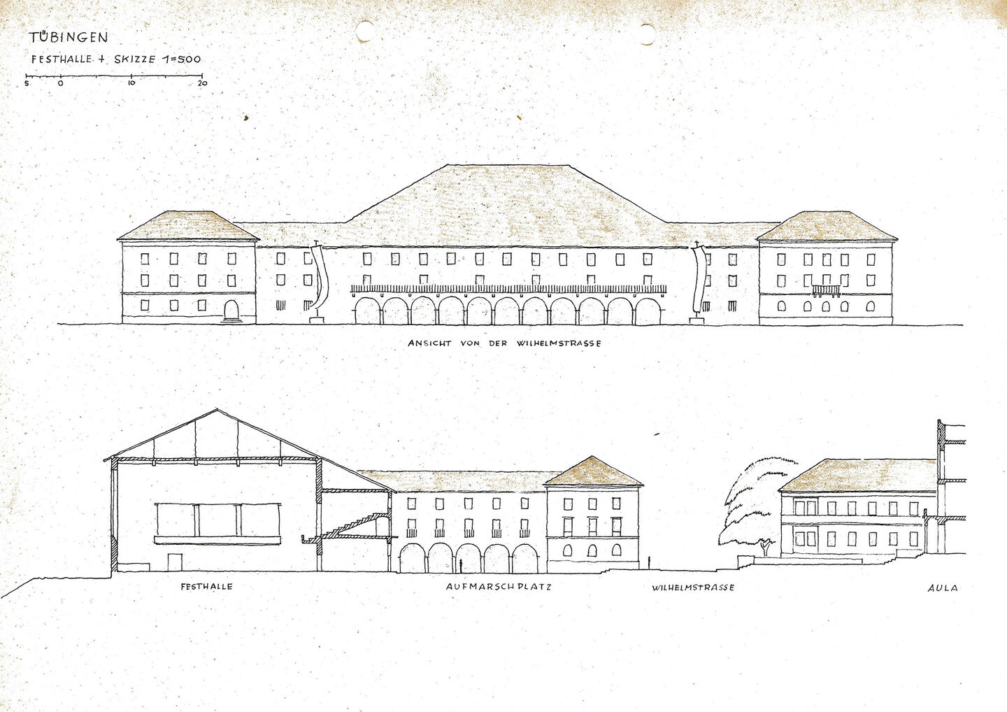 So fand sich zum Beispiel in einem Ordner eine Skizze zum Bau einer Festhalle für über 3.000 Personen. Die große Halle sollte gegenüber der Neuen Aula errichtet werden. Dazwischen wollte man einen Aufmarschplatz für 12.000 Menschen schaffen. Als Initiator muss der damalige NS-Oberbürgermeister Ernst Weinmann angesehen werden, der offenbar in einem ganz anderen Maßstab als sein Vorgänger Adolf Scheef Tübingen zur Stadt der Partei machen wollte. Bei der Skizze von 1938 handelt es sich nur um erste Überlegungen, die nie realisiert wurden. Im Jahr darauf hatte der von Hitler begonnene Zweite Weltkrieg andere Prioritäten gesetzt.