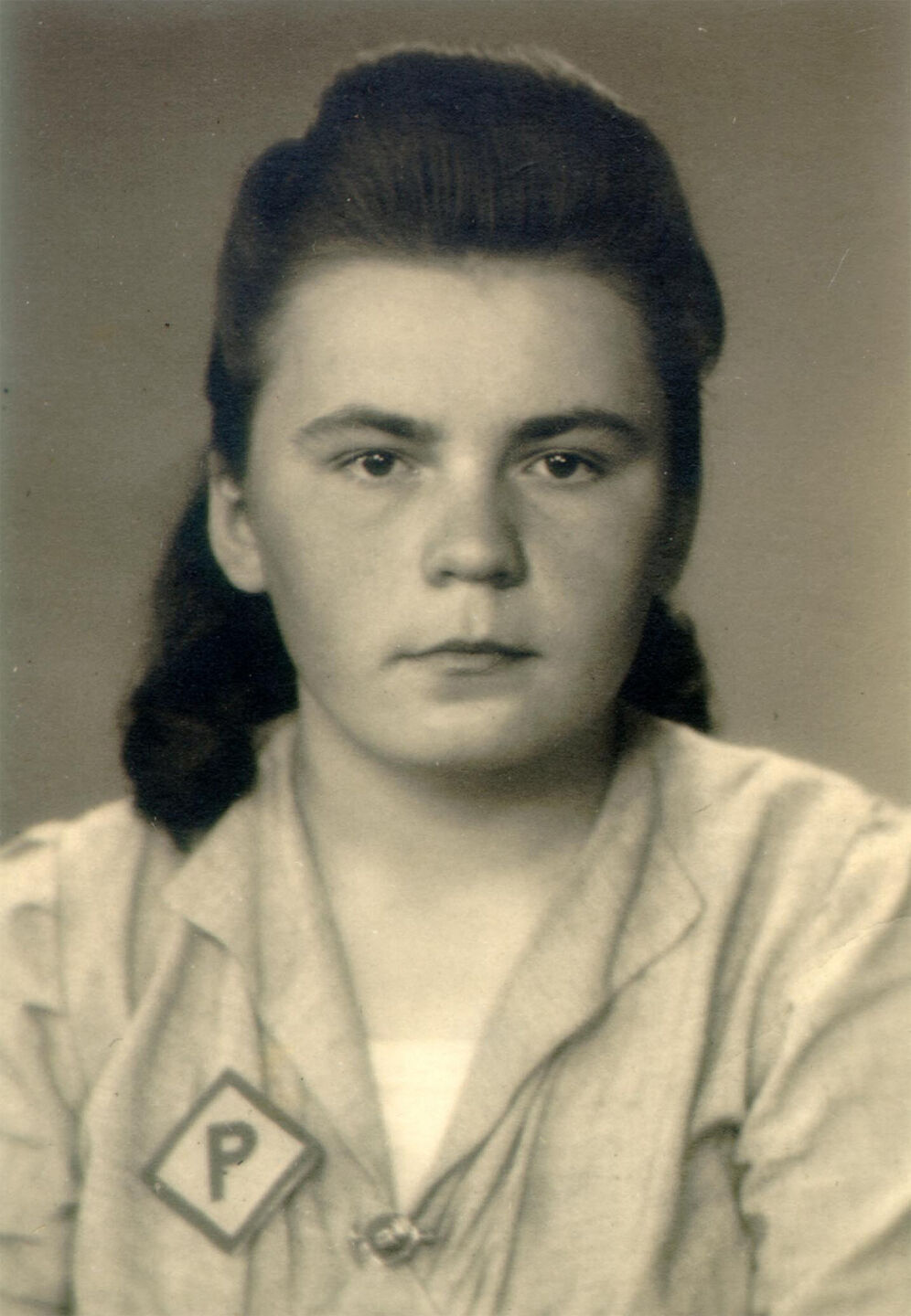 Zwangsarbeiterin mit „Polenabzeichen“, Foto undatiert. Polnische und sowjetische Zwangsarbeiter mussten auf ihrer Kleidung ein sichtbares Abzeichen („P“ bzw. „OST“) tragen. Dadurch wurde ihr Ausschluss beispielsweise aus Kinos, Gaststätten und öffentlichem Nahverkehr überwacht. Foto: Stadtarchiv Tübingen