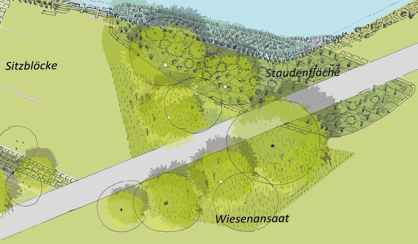 Bei der Wahl der Bepflanzung wird wie beim Vegetationskonzept für den Park auf eine Vielfalt von heimischen Arten gesetzt, die zum einen unterschiedliche Insekten anlocken und gleichzeitig durch unterschiedliche Blühformen den Erlebniswert während eines Aufenthalts erhöhen. Ein weiterer wichtiger Aspekt ist auch hier eine Bepflanzung, deren Pflegeaufwand nicht zu hoch ist, um langfristig den Erhalt dieses Konzepts zu gewährleisten.
