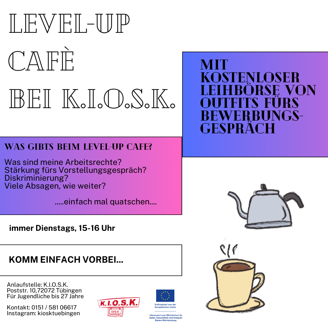 Das Level-Up Café bietet jeden Dienstagnachmittag Beratung und Austausch zu Themen rund um Arbeit und Ausbildung an: Ob Arbeitsrecht, Vorbereitung fürs Vorstellungsgespräch, Diskriminierung und anderes.