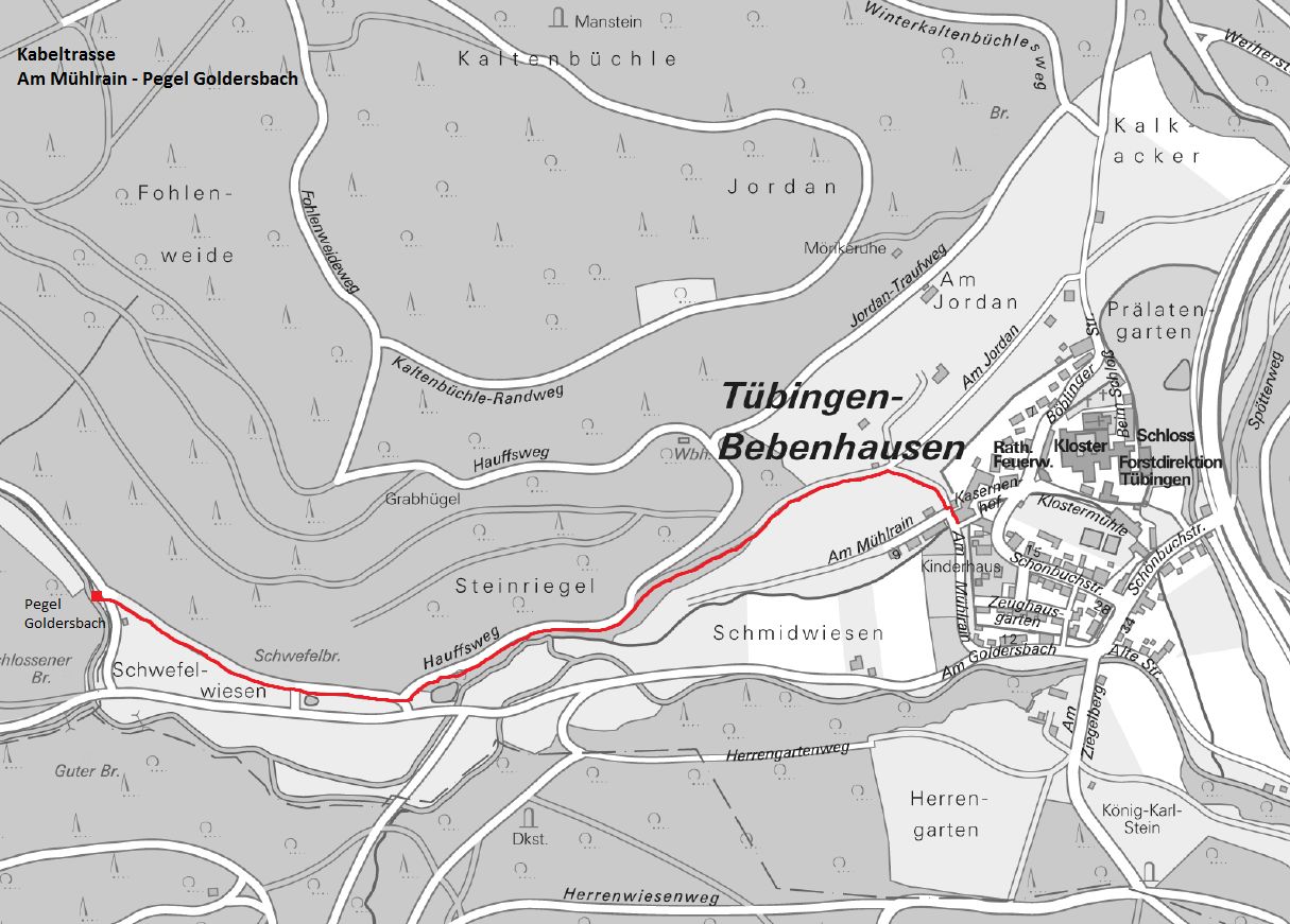 Ab Montag, 16. April 2018, wird im Goldersbachtal ein Erdkabel verlegt (Plan in der Anlage). Mit dem Kabel soll die zuverlässige Datenübertragung vom Pegel zur Feuerwehr sichergestellt werden. Das dient dem Hochwasserschutz für Lustnau.