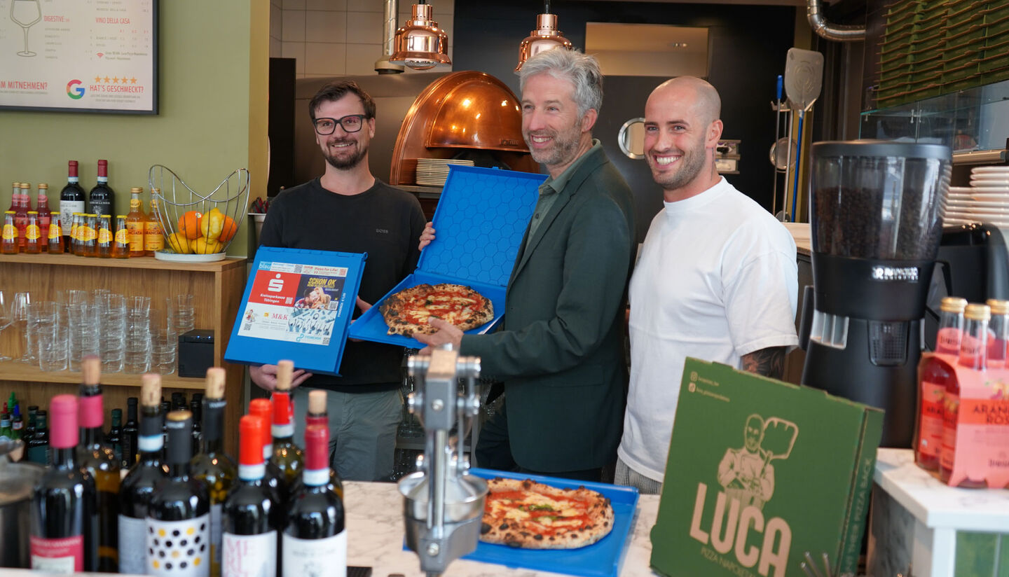 Kay Bock (Trikora Deutschland GmbH), Oberbürgermeister Boris Palmer und Luca Leimgruber (Luca Pizza) mit der neuen Mehrweg-Pizzabox (von links). Bild: Universitätsstadt Tübingen