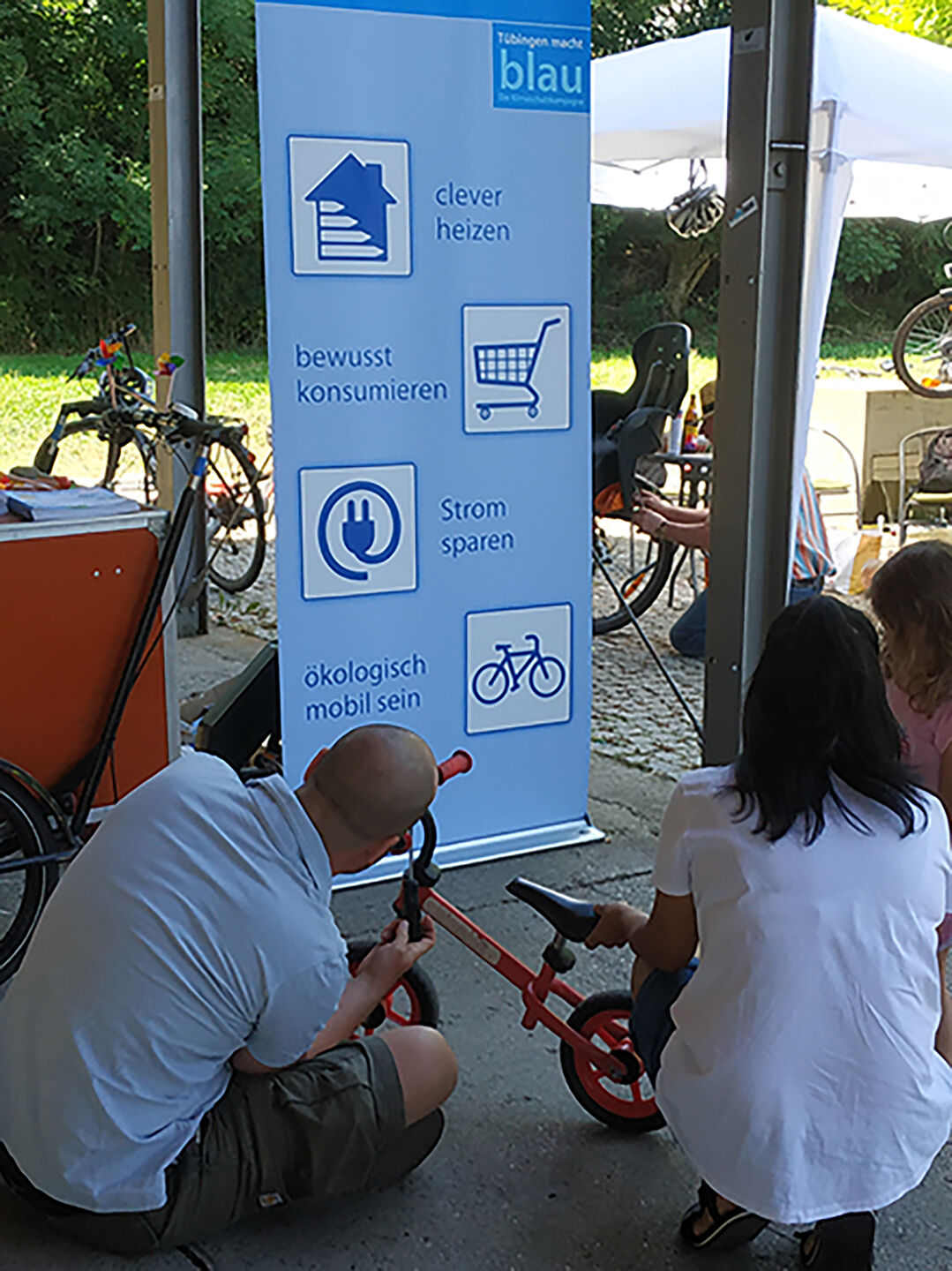 Am 16. Juli 2022 informierten die Mitarbeiter_innen der Stabstelle Umwelt- und Klimaschutz beim KIT Radaktionstag in der Panzerhalle über umweltfreundliche Mobilitätsangebote und Fördermittel der Universitätsstadt Tübingen. Es wurden diverse Fahrräder mit „Tübingen macht blau“ Klingeln nachgerüstet.