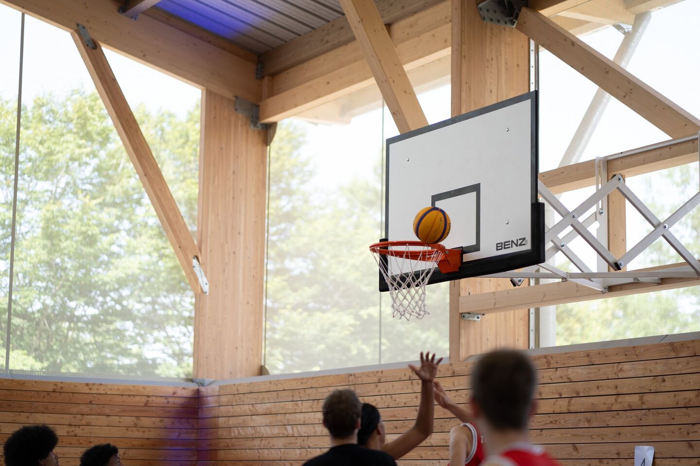 Halle, Nebengebäude und die umlaufende Prallwand sind in Holz konstruiert, lediglich die Fundamente und Bodenplatte sind massiv aus Stahlbeton. Auf dem Trapezblechdach findet eine große PV-Anlage mit 237 KWp Platz. Die Flächen zwischen Prallwand und Dach sind mit einer mikroperforierten Membran geschlossen, die luftdurchlässig ist, aber weitgehend Regen, Schnee und Laub abhält.