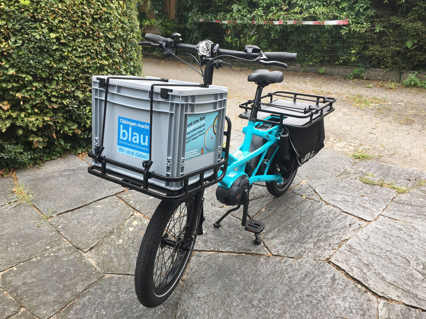 von der Stadt gefördertes Lastenrad mit dem Aufkleber Tübingen macht blau auf der Box