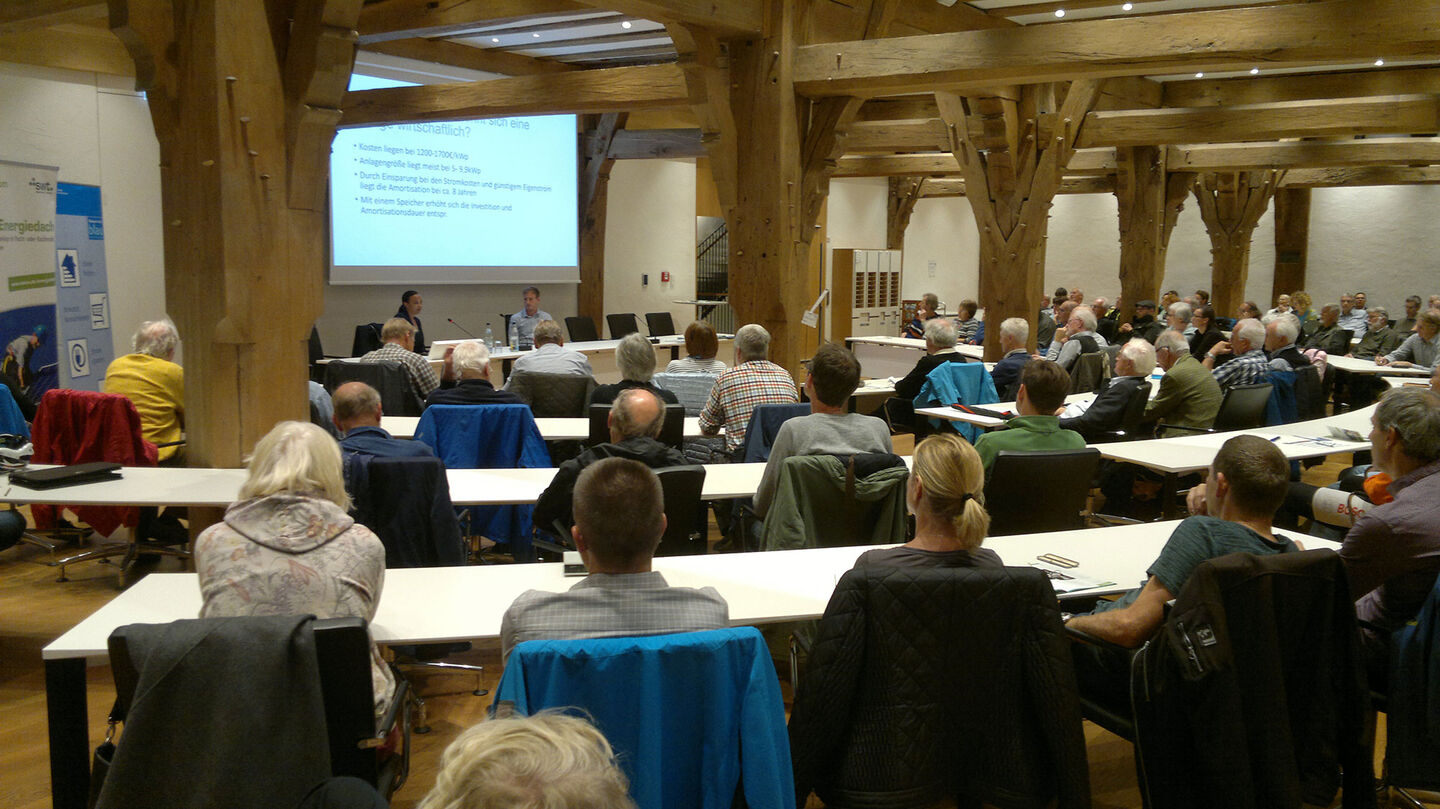 Wie können Dachbesitzerinnen und -besitzer mit Hilfe von Photovoltaikanlagen ihr Dach blau machen und so einen Beitrag zum Klimaschutz leisten? Für diese Frage interessierten sich im Oktober über 100 Zuhörerinnen und Zuhörer.