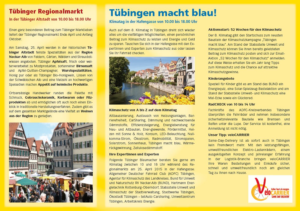 Von A wie Altbausanierung über F wie Fördermittel bis Z wie Zellulose-Dämmstoff: Wie man einen persönlichen Beitrag zum Klimaschutz leisten kann, stand im Mittelpunkt des Klimatags am Samstag, 25. April 2015, in der Hafengasse. Von 10 bis 18 Uhr hatten Interessierte die Möglichkeiten, sich parallel zum Regionalmarkt über Umwelt- und Klimaschutzmöglichkeiten zu informieren. Wer mochte, konnte sein Fahrrad kostenlos durchchecken lassen.