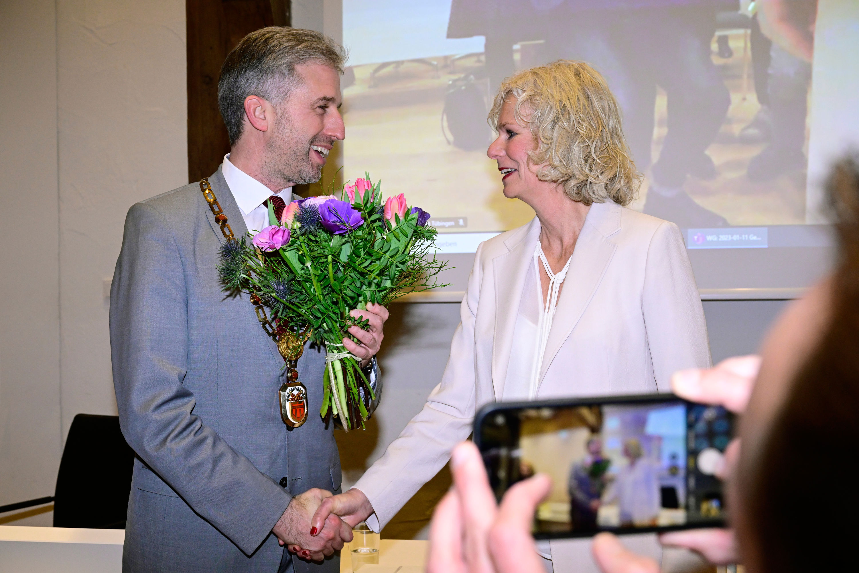 Stadträtin Annette Schmidt nimmt offizielle Verpflichtung von Oberbürgermeister Boris Palmer für seine dritte Amtszeit vor.
