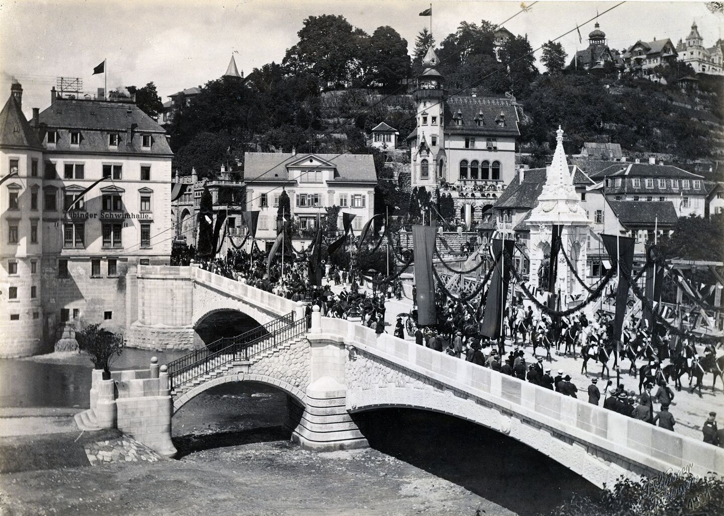Die neue Neckarbrücke wurde bis 1901 nach den Plänen von Karl Leibbrand und Heinrich Halmhuber ausgeführt. Sie hatte zwei elegant geschwungene Bögen und war im Kern aus modernem Stampfbeton. Ihre Breite (13,70 Meter) und Tragkraft waren so berechnet, dass darauf auch eine Straßenbahn verkehren konnte – ein futuristischer Plan, der bis heute auf seine Verwirklichung wartet.