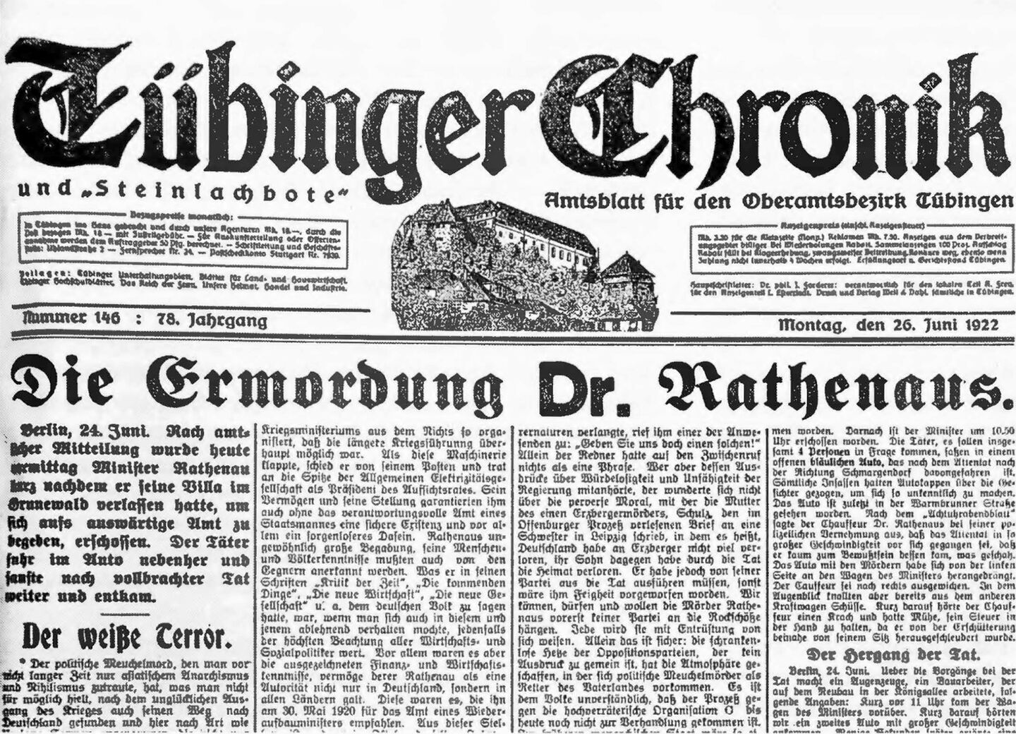 Die Tübinger Chronik berichtete ausführlich über die Ermordung des jüdischen Außenministers Walther Rathenau durch Rechtsradikale am 24. Juni 1922. Foto: Tübinger Chronik/Stadtarchiv Tübingen